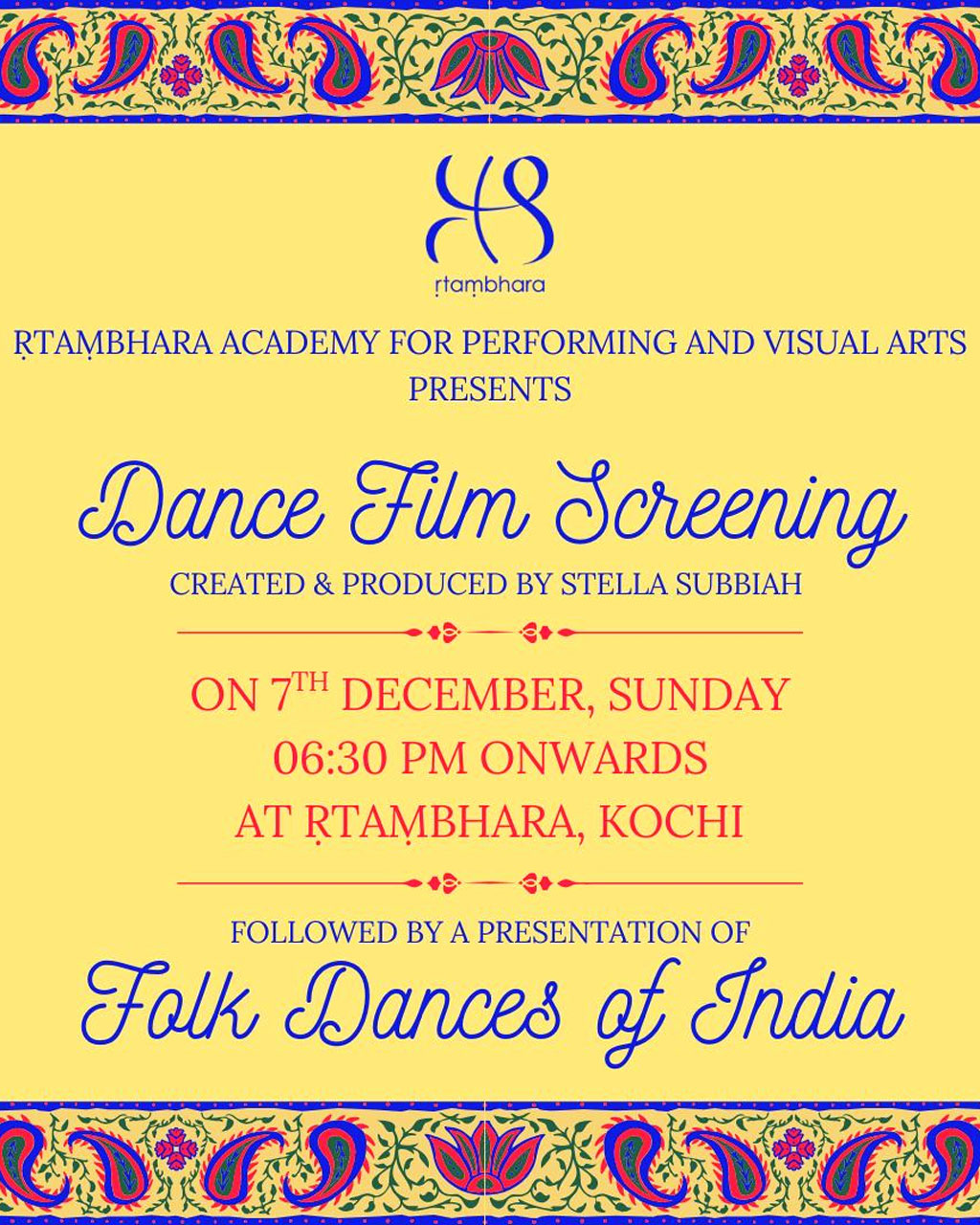 tambhara Academy For Performing And Visual Arts presents an evening that celebrates movement, storytelling, and cultural expression through a Dance Film screening Created & Produced by Stella Subbiah. The screening will be followed by a presentation on the Folk Dances of India by students of Rtambhara, offering a glimpse into the country’s diverse rhythmic heritage.